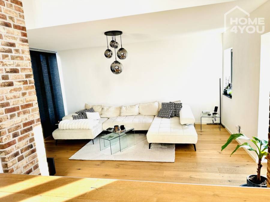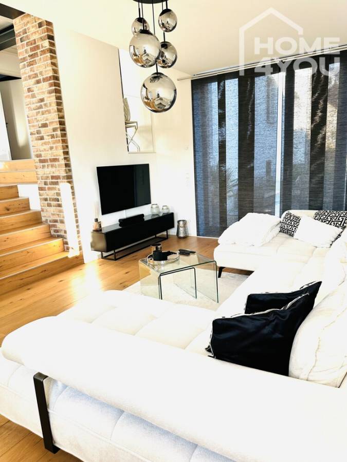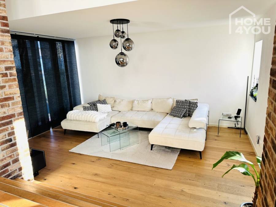 The raised first floor apartment with very high living quality extends over 2 levels and has 2 bedrooms, a modern bathroom with walk-in shower and bathtub, double washbasins, a toilet separate from the bathroom, a spacious, bright and open living/dining area with an open-plan kitchen and a second adjoining living room.