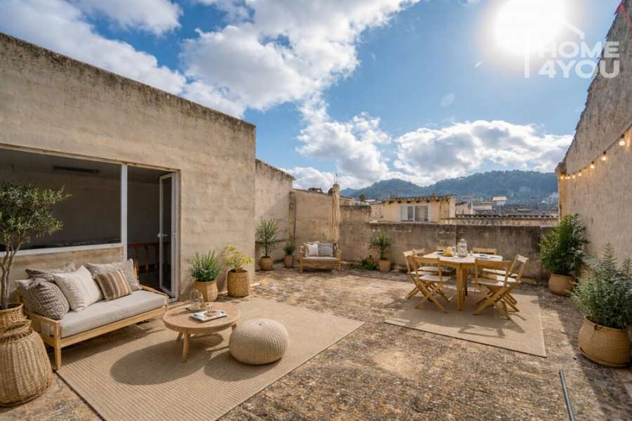 The outdoor area impresses with a spacious garden and a generous roof terrace of approx. 80 m² – with views over the rooftops of Felanitx.