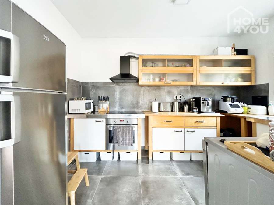 On the first floor, there is a 65 m² apartment with two bedrooms, a modern bathroom and an open-plan living and dining area with a fireplace. The direct access to a large terrace and the approx. 200 m² garden creates a pleasant living atmosphere with plenty of open space. There is also a separate room with its own bathroom and kitchenette – perfect as a guest room, studio or home office. An attached garage ideally complements this unit.