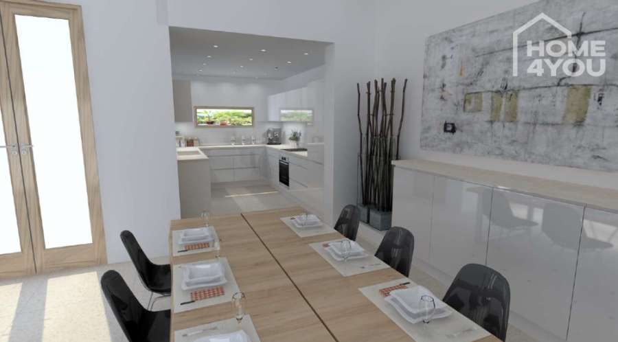 The garden at the rear of the property invites you to create a private outdoor area – a patio with lounge area, a small pool or Mediterranean planting are all conceivable options here. The upper floor offers the option of extending with an additional terrace overlooking the greenery.