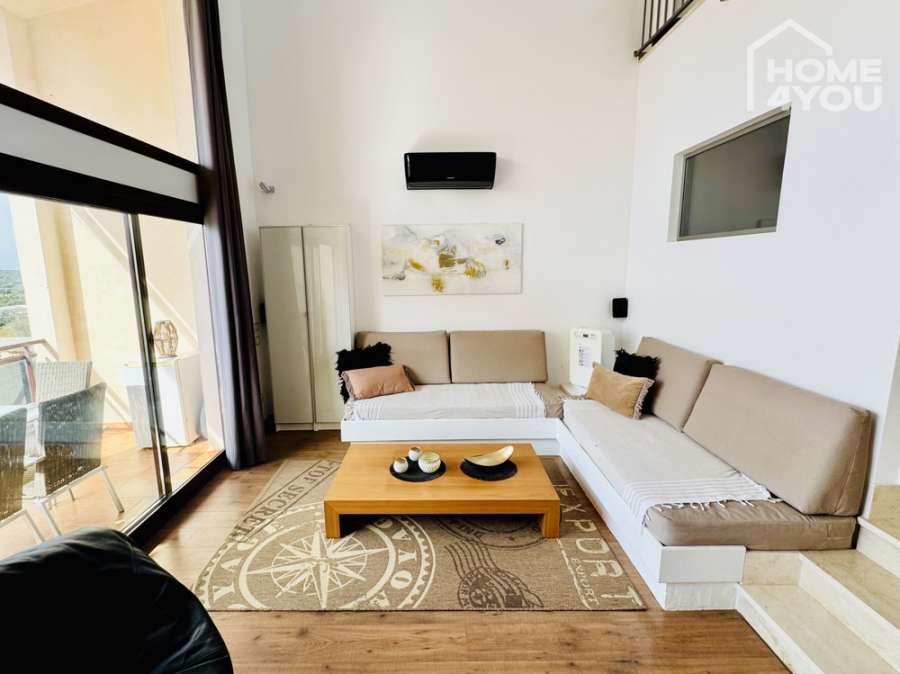 Die Fenster aus Aluminium mit Doppelverglasung, überwiegend als Schiebeelemente ausgeführt, bieten hervorragende Isolierung und ein modernes Erscheinungsbild. In Kombination mit den bodentiefen Vorhängen entsteht ein harmonisches Zusammenspiel aus Privatsphäre und natürlichem Licht.