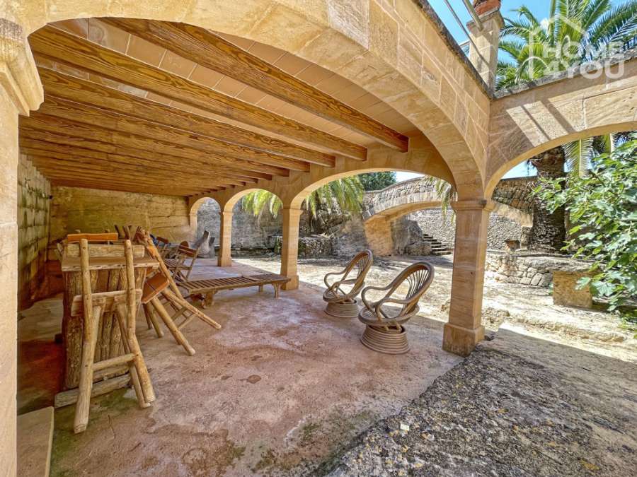 GROUND FLOOR: Main entrance | three double bedrooms | two bathrooms | living / dining area with motorized fireplace | large, open kitchen with bar counter | covered outdoor kitchen with barbecue | large outdoor terrace with chillout & dining area| fountain & cistern | access to saltwater pool & pool house | access to garden with fountain and irrigation system | cool courtyard with bridge modeled after the bridge of Pollenca| stone sculptures carved by hand | tables made of Majorcan stone blocks | outdoor parking spaces | imposing driveway with turning circle in front of building