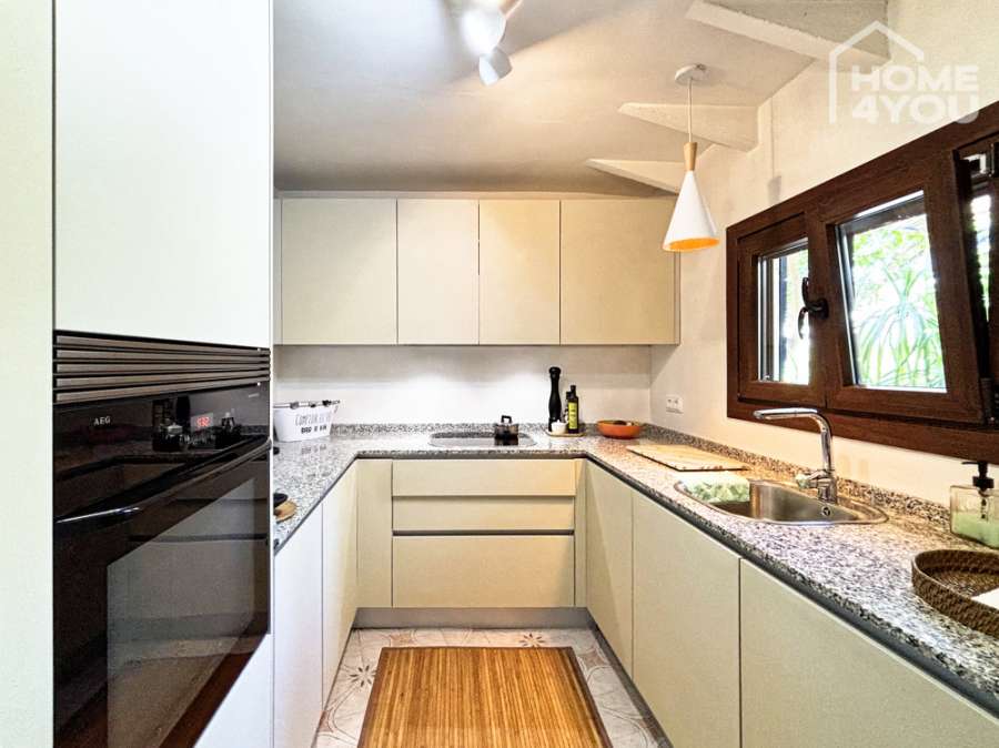 La cocina amueblada, recién instalada en 2023 con electrodomésticos de fabricantes de renombre, permite una cocina moderna de alto nivel. El estado de la vivienda le permite mudarse directamente sin necesidad de reformas – casi todos los muebles y el interior permanecen en la casa.