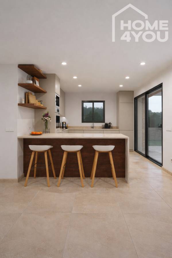 Das Herzstück der Immobilie ist der großzügige, offen gestaltete Wohn-, Ess- und Küchenbereich, der mit viel Tageslicht, modernen Linien und direktem Bezug zum Außenbereich ein einladendes Wohngefühl schafft. Die elegante Küche mit Kochinsel fügt sich harmonisch in das Gesamtbild ein und macht diesen Bereich zum perfekten Mittelpunkt des Hauses. Ein zusätzliches Zimmer im Erdgeschoss eignet sich ideal als Gästezimmer, Homeoffice oder flexibel nutzbarer Rückzugsort.